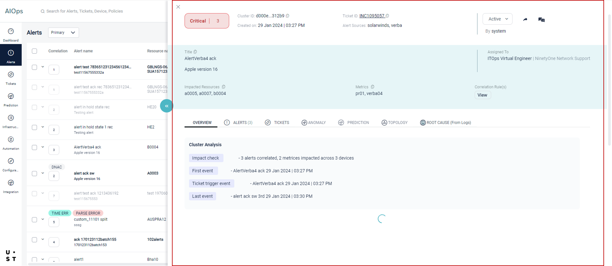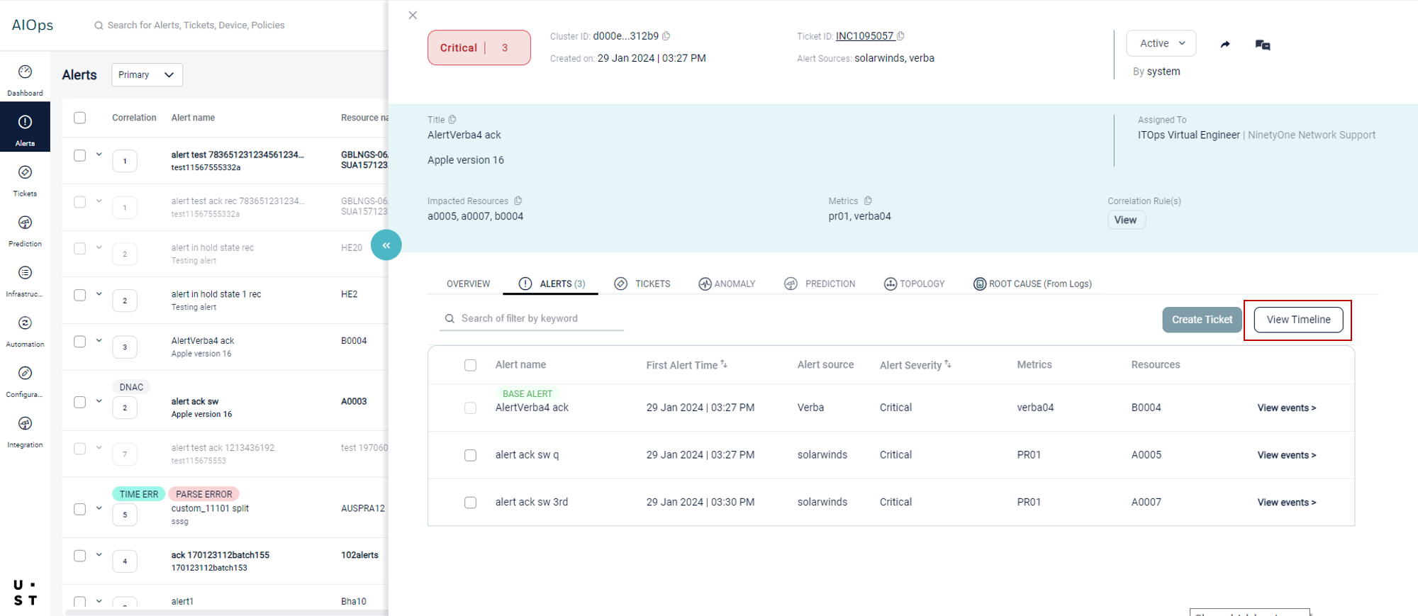 Screen Navigation: AIOps > Project > Alerts