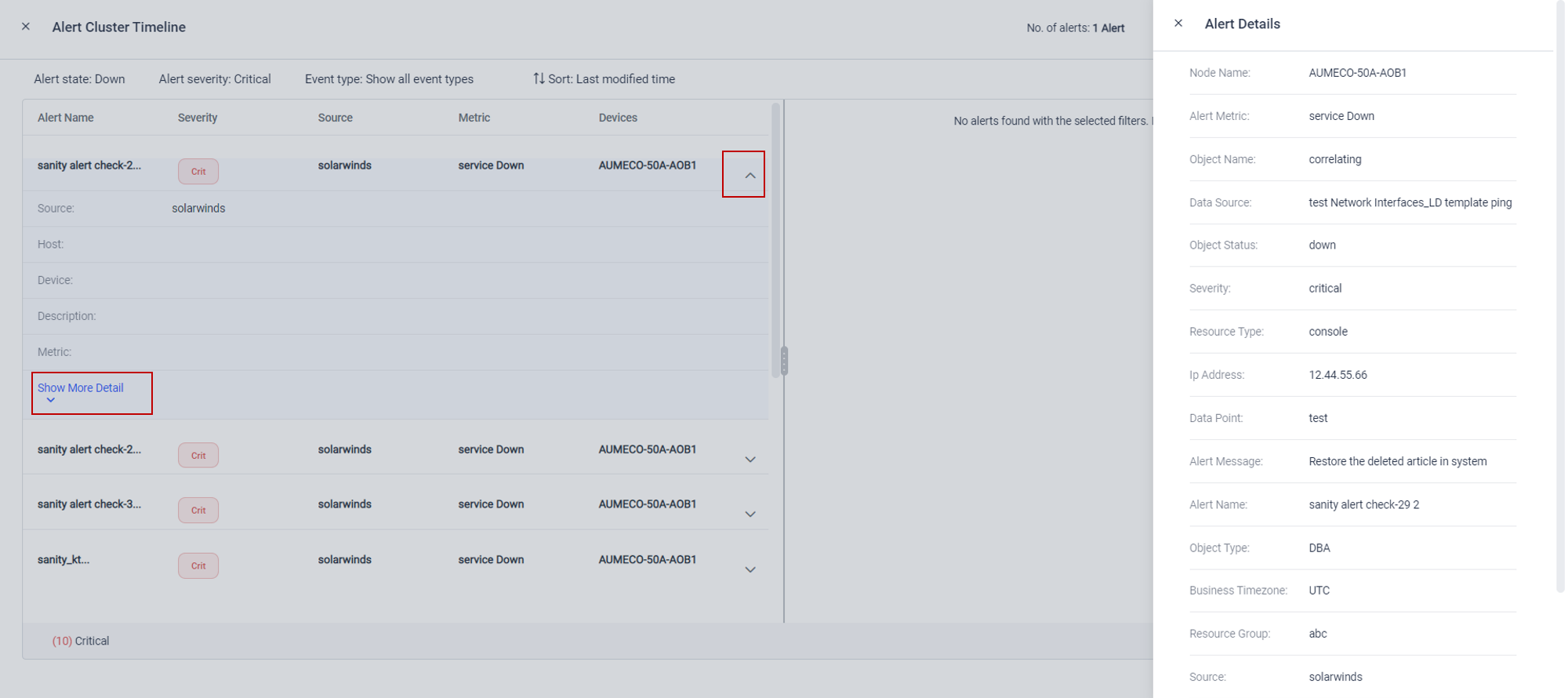 Alert details can be obtained by expanding the dropdown corresponding to an alert, and selecting Show more Details.
