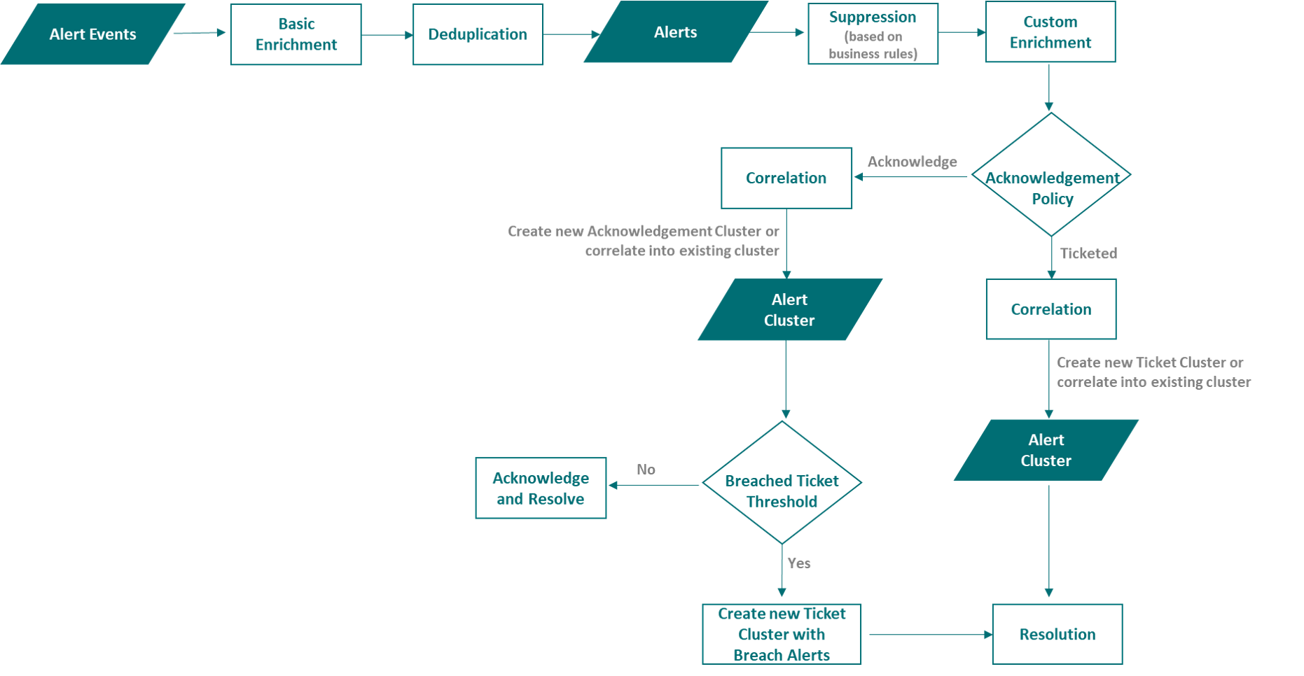 You can define the criteria for an acknowledgement alert using acknowledgement policy. ACK alerts will be ticketed only if a threshold breach happens. (defined in ticket threshold policy). An ACK alert could meet the criteria of a recovery alert or failure alert.