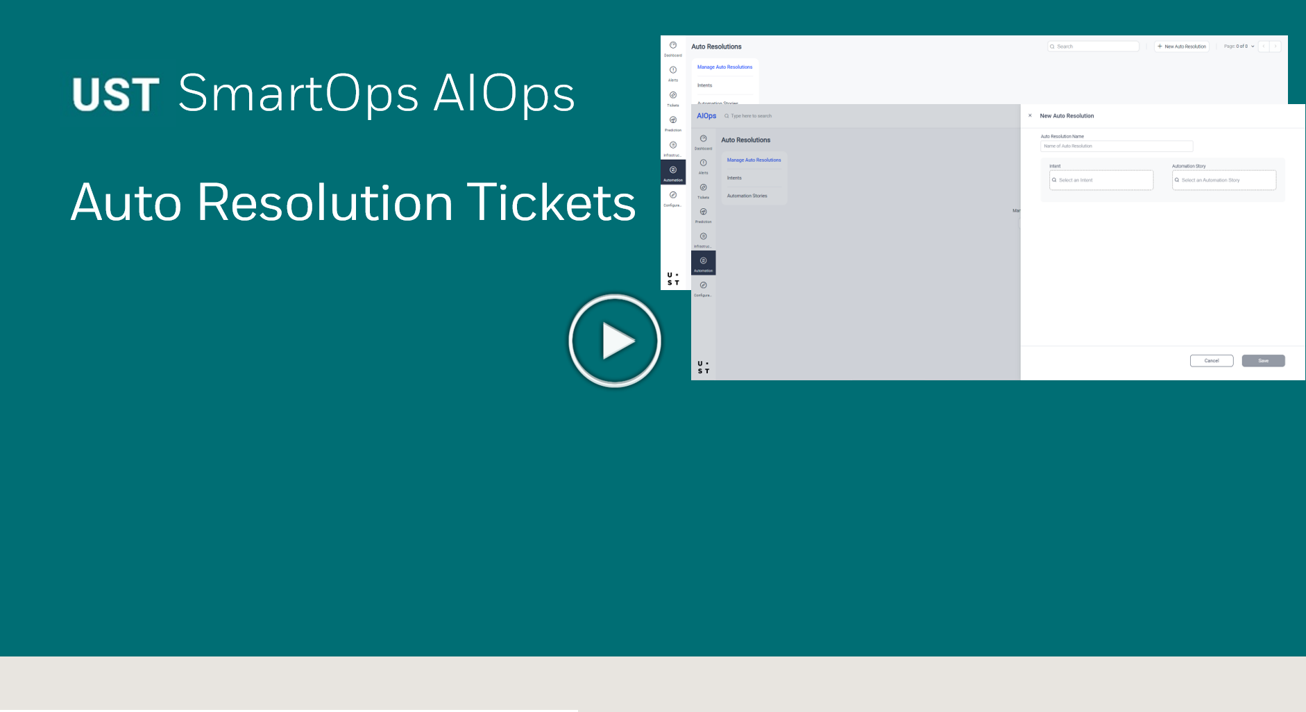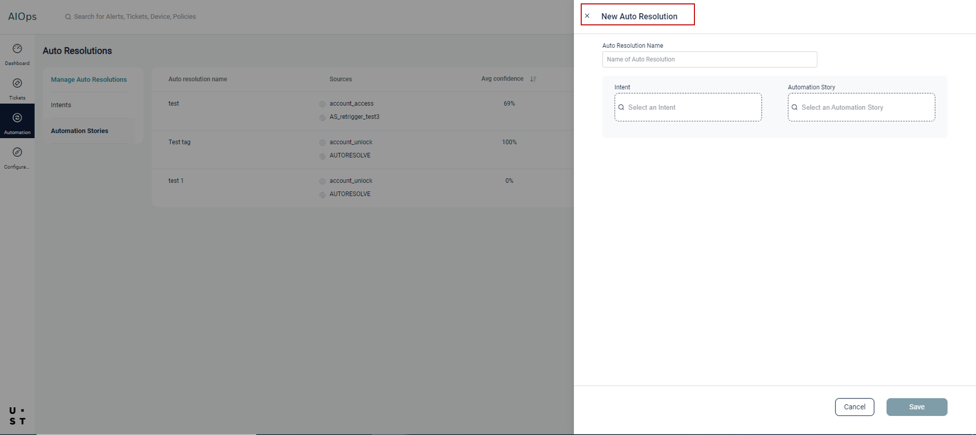 The tickets in SmartOps AIOps can be resolved using automation stories created in SmartOps Core Platform. Auto Resolution detects the intents from incoming tickets, extracts related data from the ticket and use that data to run an automation story for resolving the issue mentioned in the ticket. The intents identified are mapped to automation story which contains the workflow to resolve the issue.