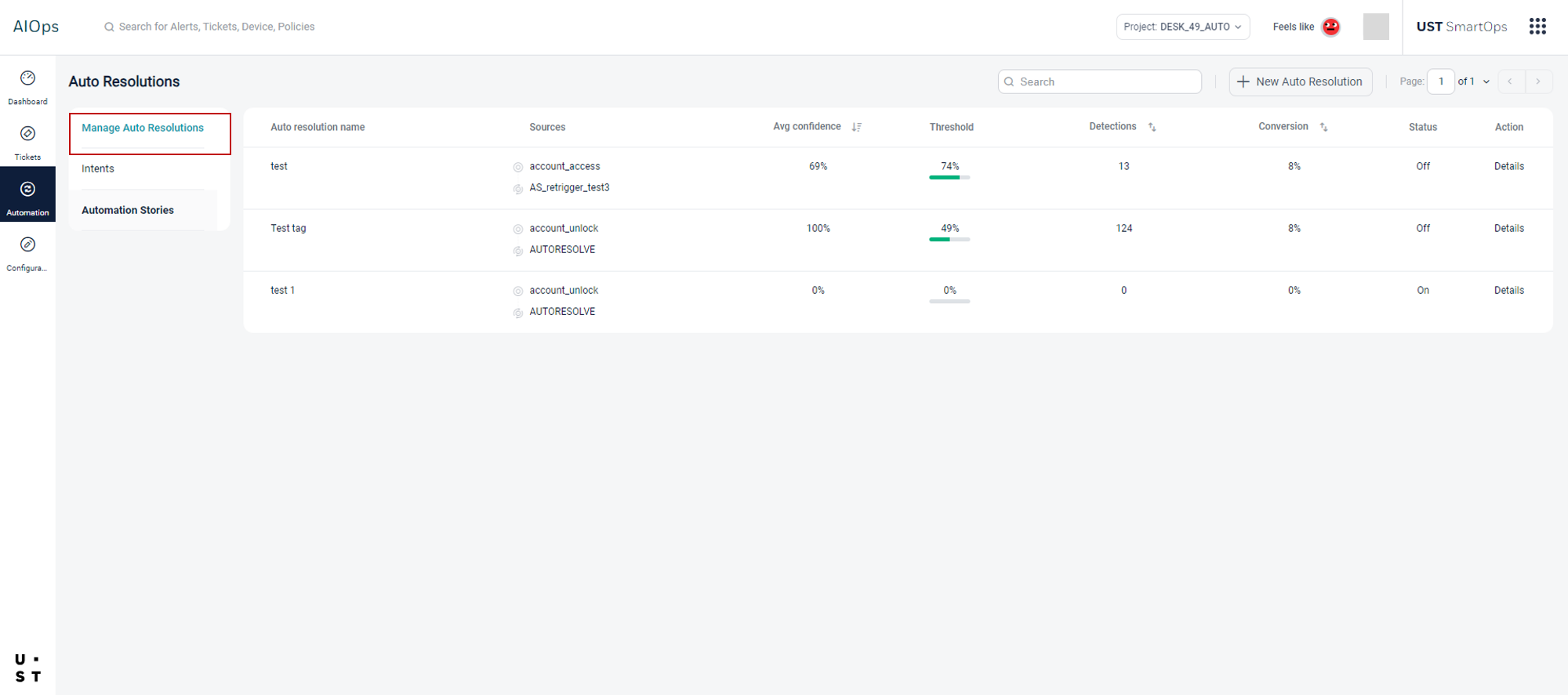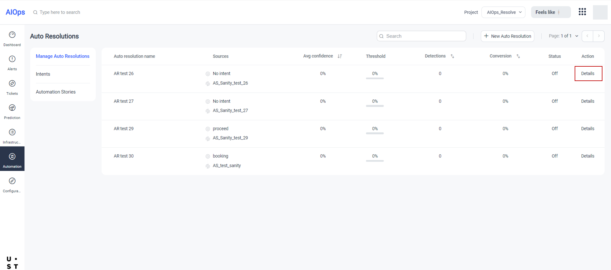 Go to Automation tab and select Manage Auto Resolutions. Existing Auto Resolutions will appear in this screen.