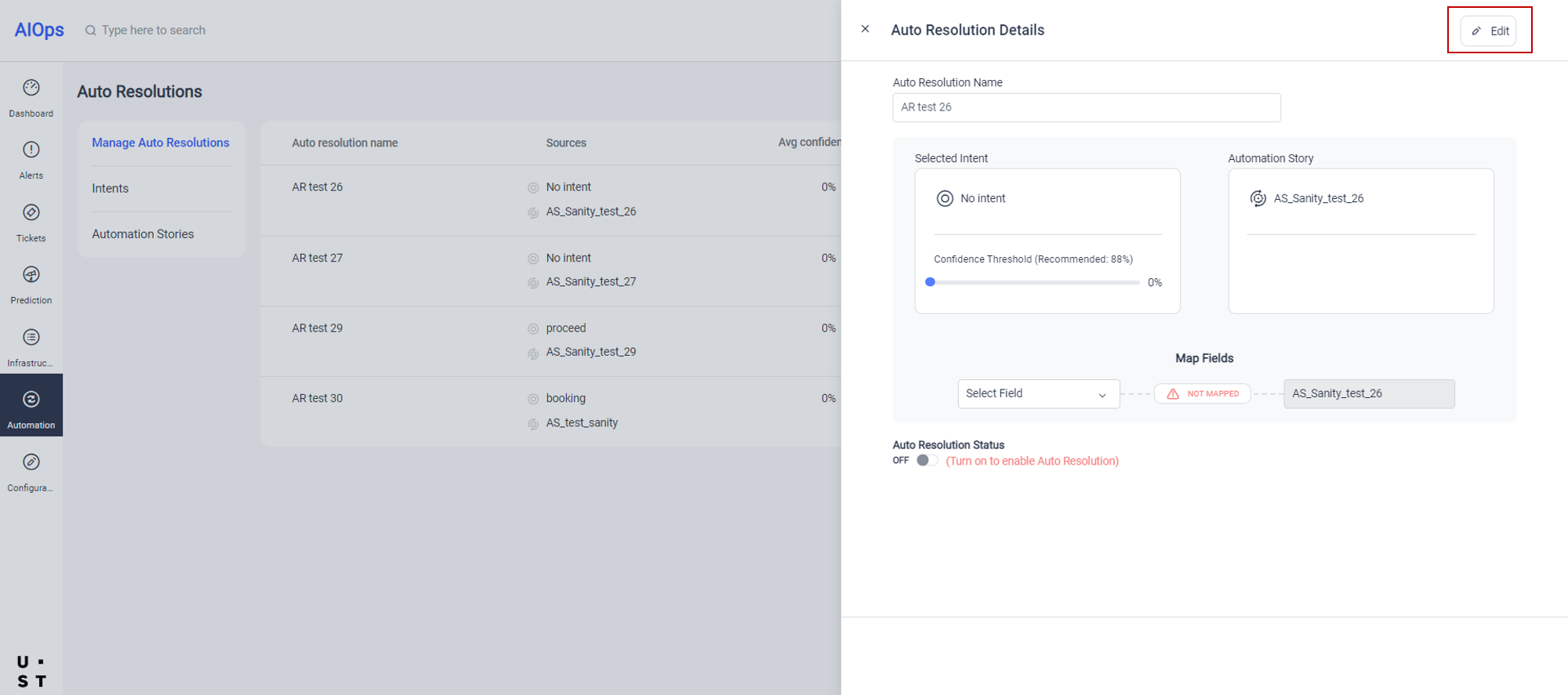 Here you need to select an intent and automation story and map the extracted ticket fields to the automation story input fields. On saving, the new resolution will get listed in the Manage Auto Resolutions screen.
