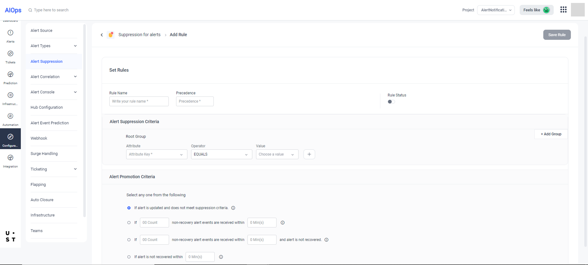 User can set the precedence and configure the Alert Suppression and Promotion Criteria from here.