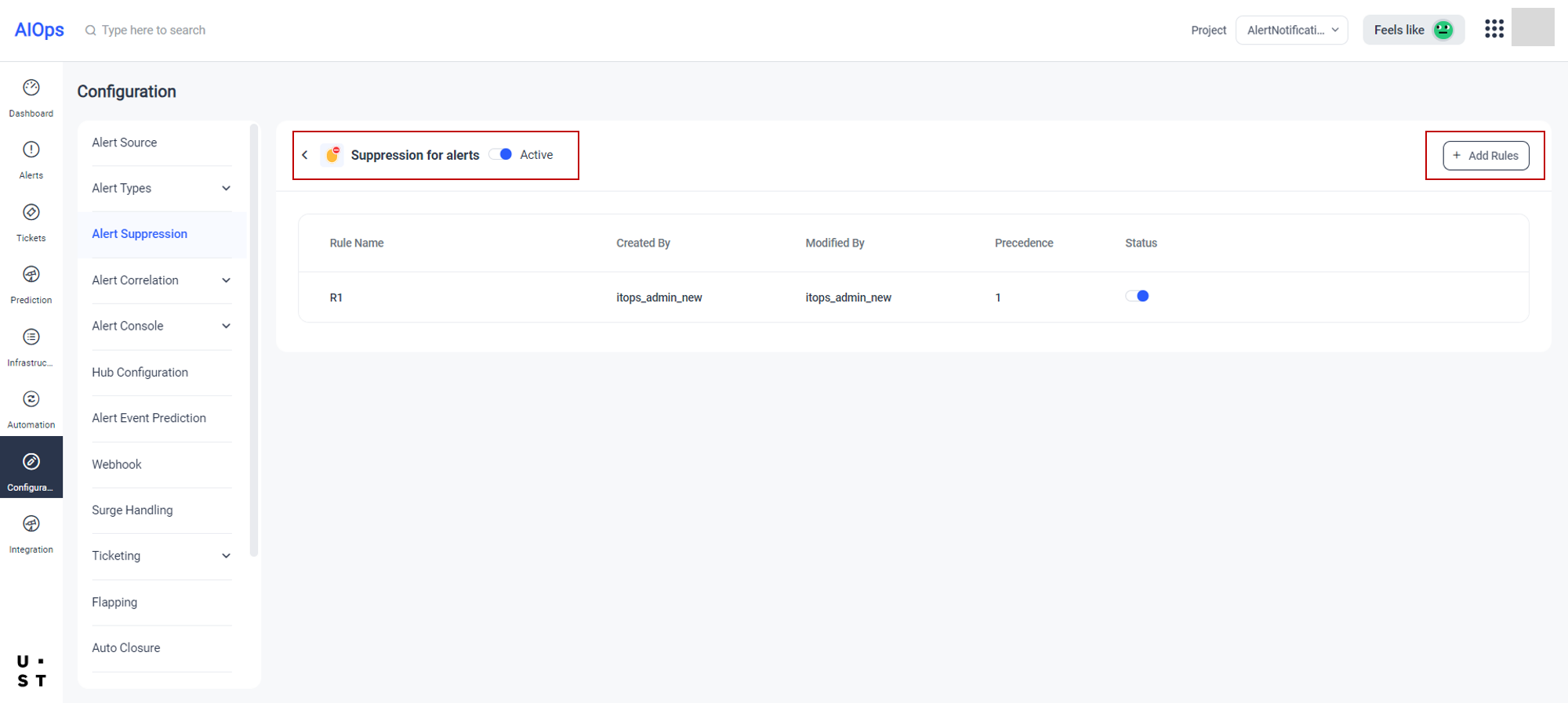 User can create Rules for suppression by selecting the Add Rule button. Already created Rules will be listed in this screen.
