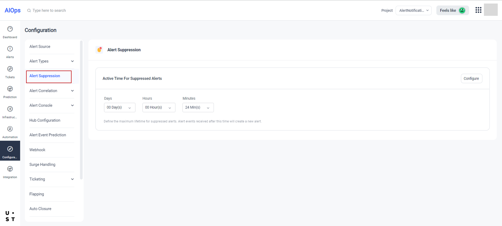 Select the Configure button from the Alert Suppression screen. Following screen will appear.