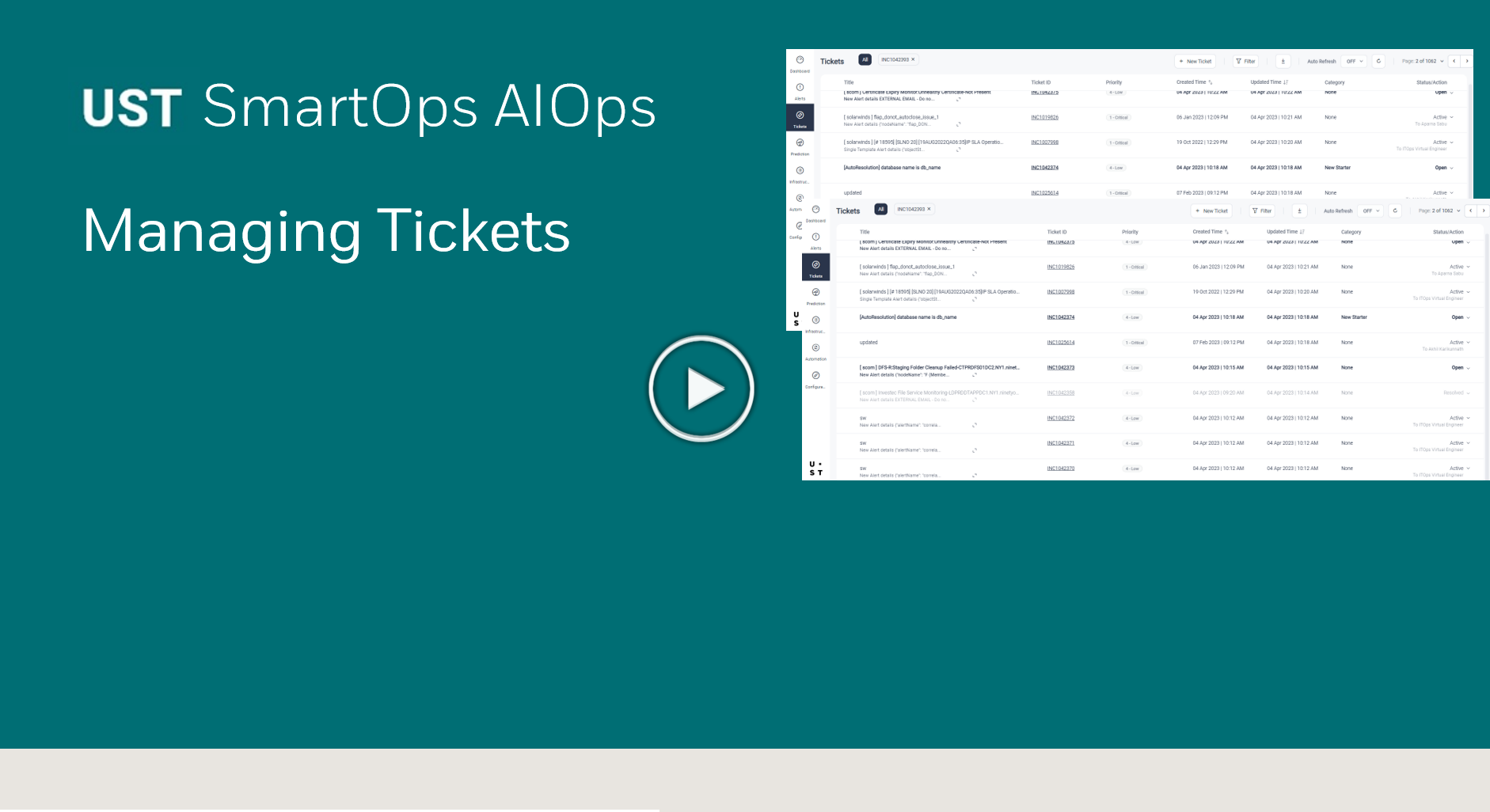 UST SmartOps™ AIOps auto creates tickets from an alert cluster of correlated alerts. It provides the capability to auto-triage and assign tickets, along with multiple features to quickly resolve the problem, such as zero-touch auto-resolutions, similar ticket recommendations, automated workflows and recommendations based on previous resolutions.
