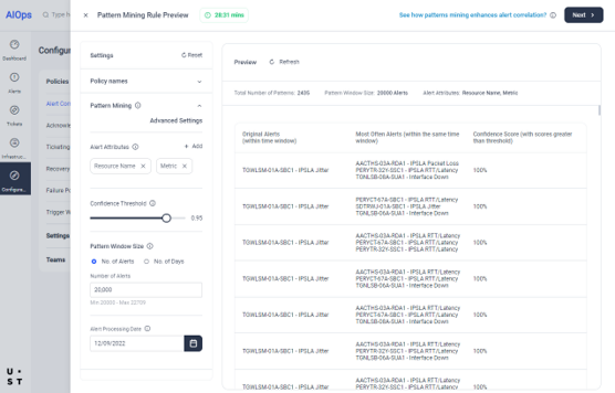 AIOps Pattern Mining feature is an AI capability that mines through alert history to identify alert patterns. These patterns will typically reflect derived associations such as topology, from the historic patterns of alerts. These patterns can then be used to augment alert correlation.