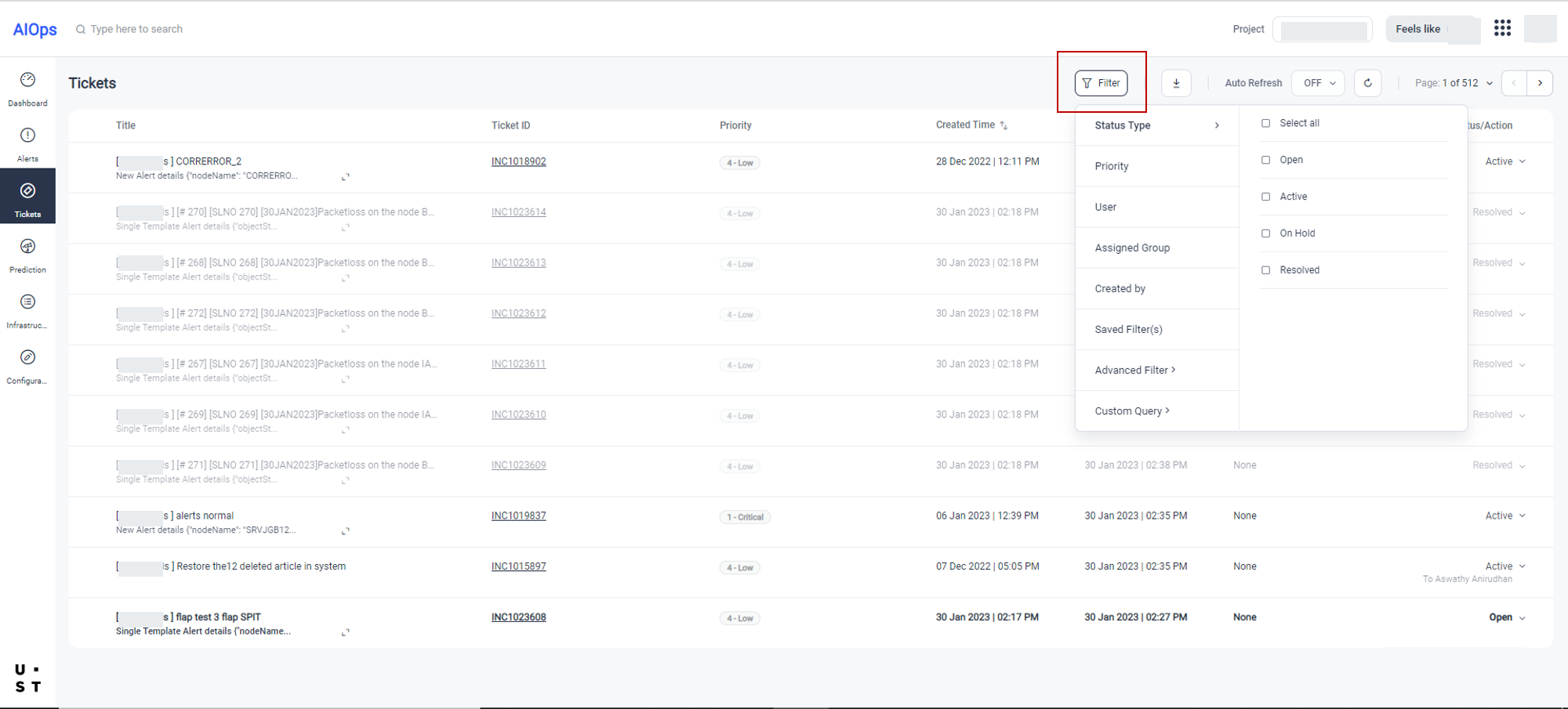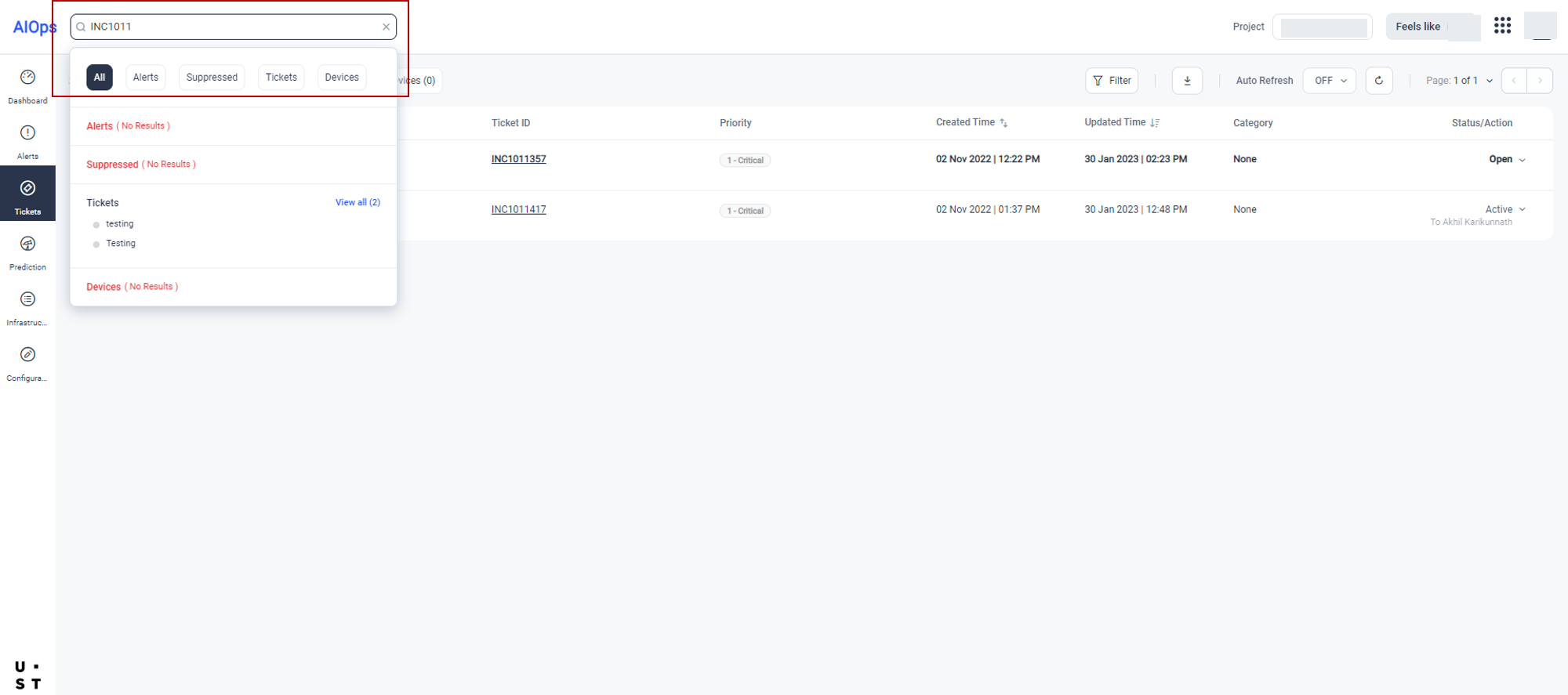 AIOps allows you to search and list tickets using partial or full ticket Id.