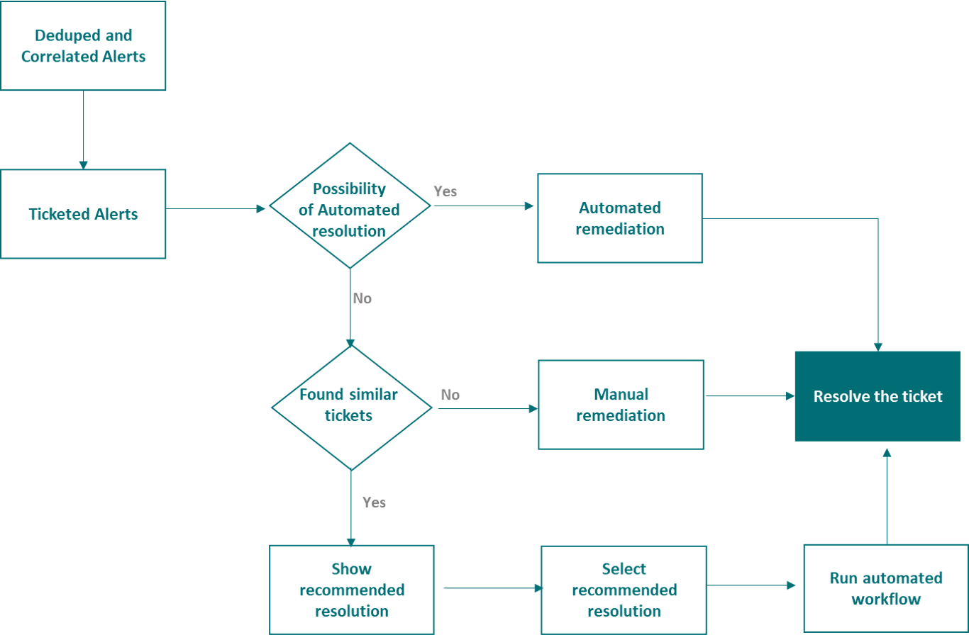 When AIOPs receives the alerts, based on the configured policies, it will correlate and ticket these alerts. Once the ticket is created, the ticket can be auto-remediated using AIOps Auto Resolutions, or resolved by a support engineer. Support engineers have multiple features to aid them in fast resolution.